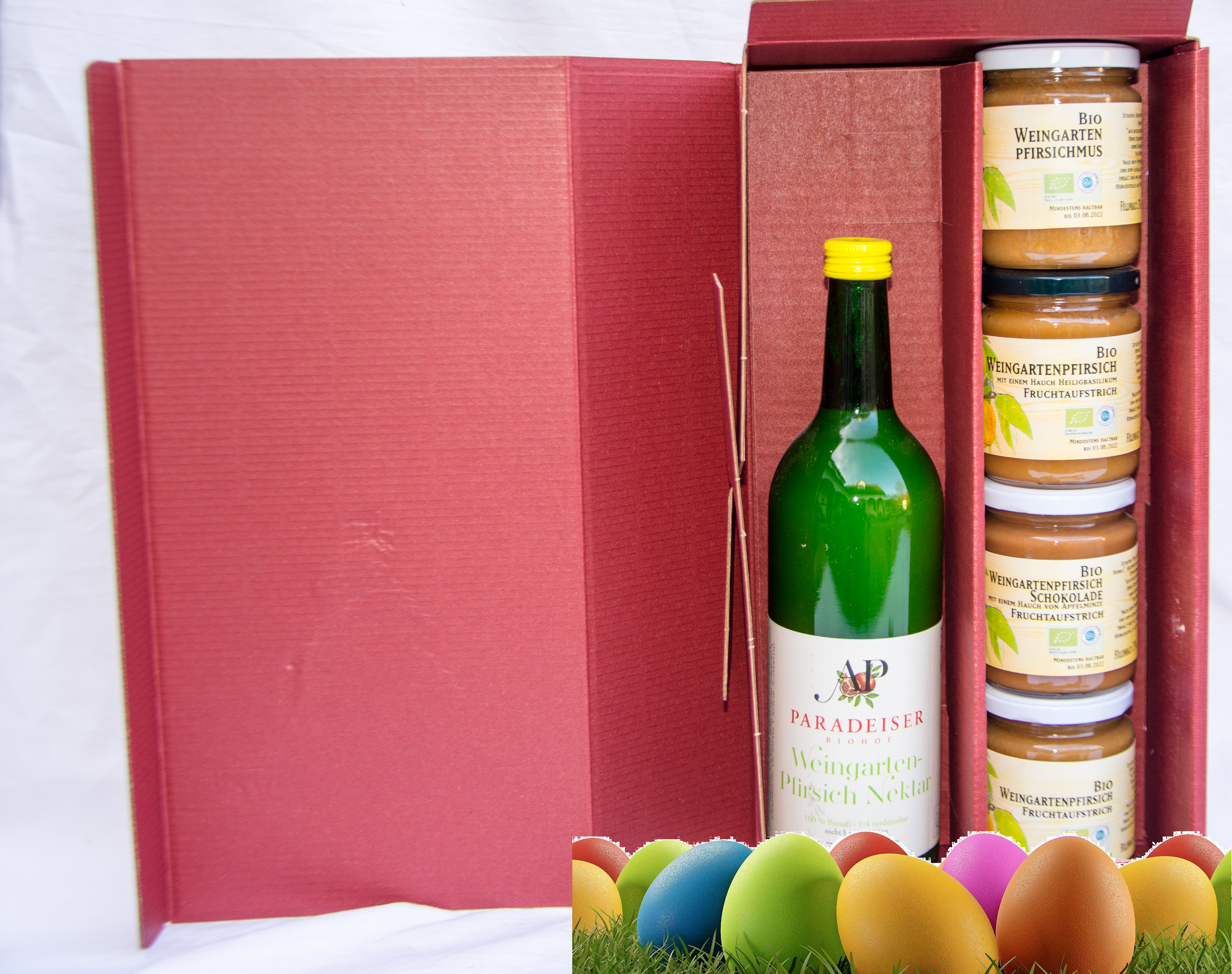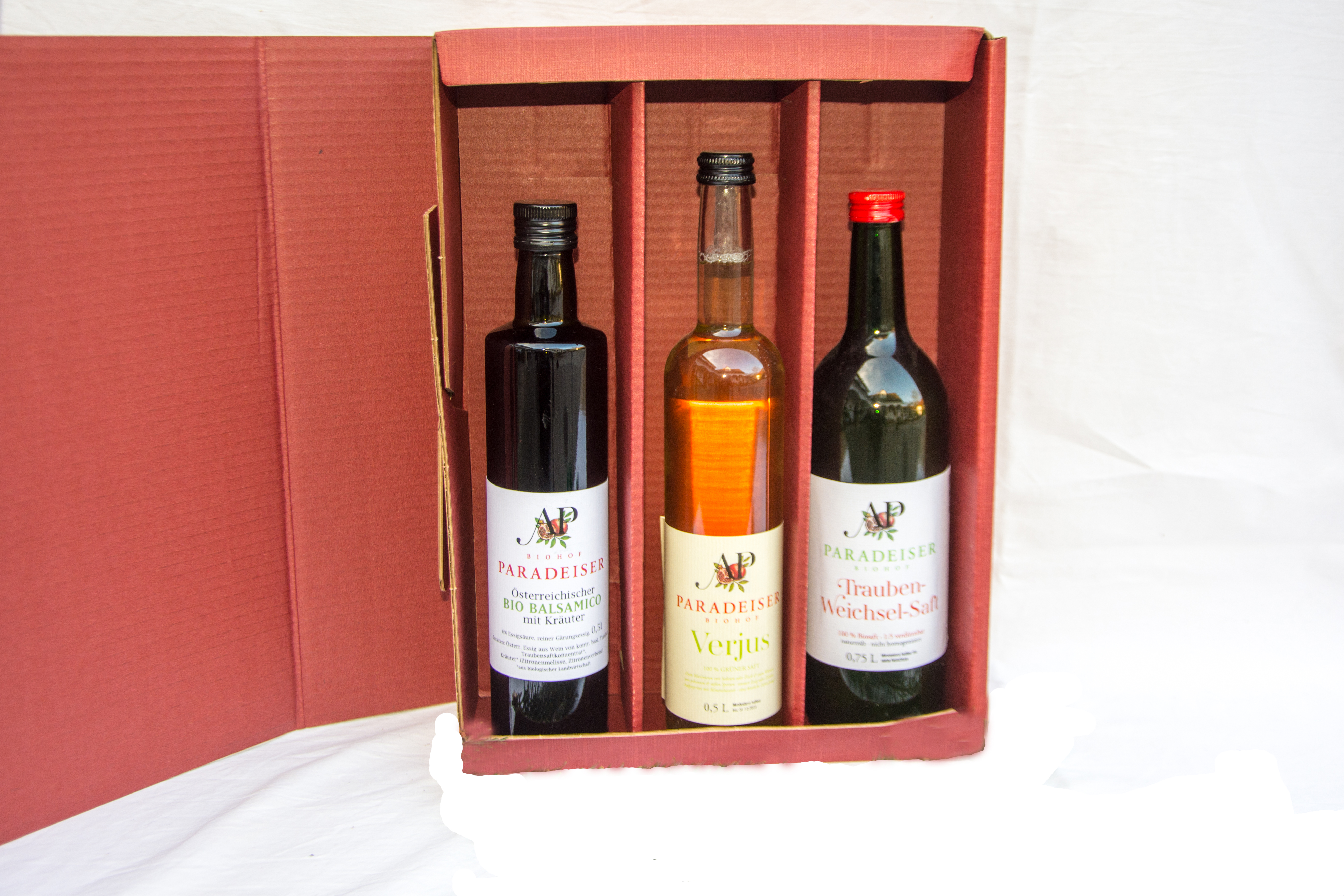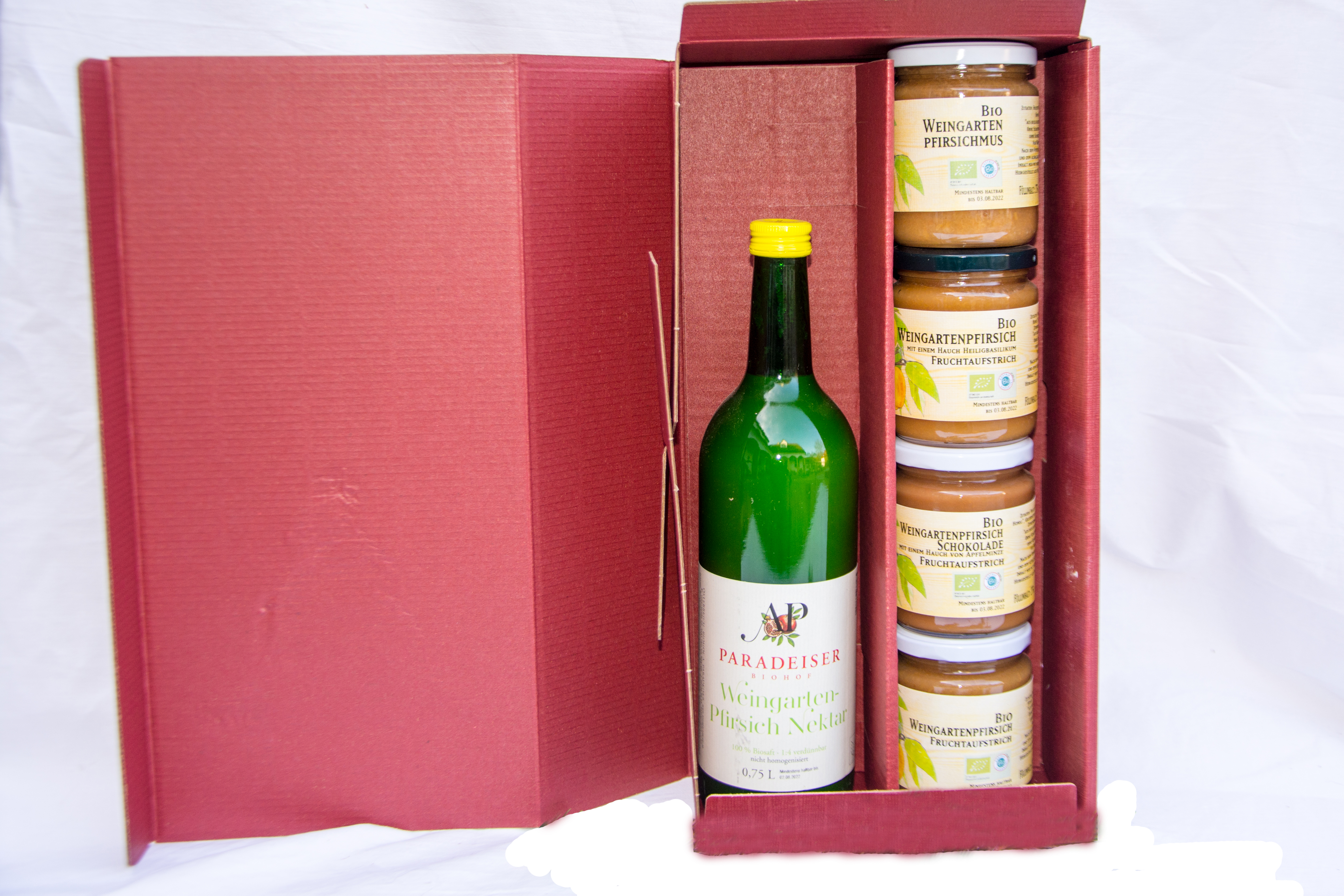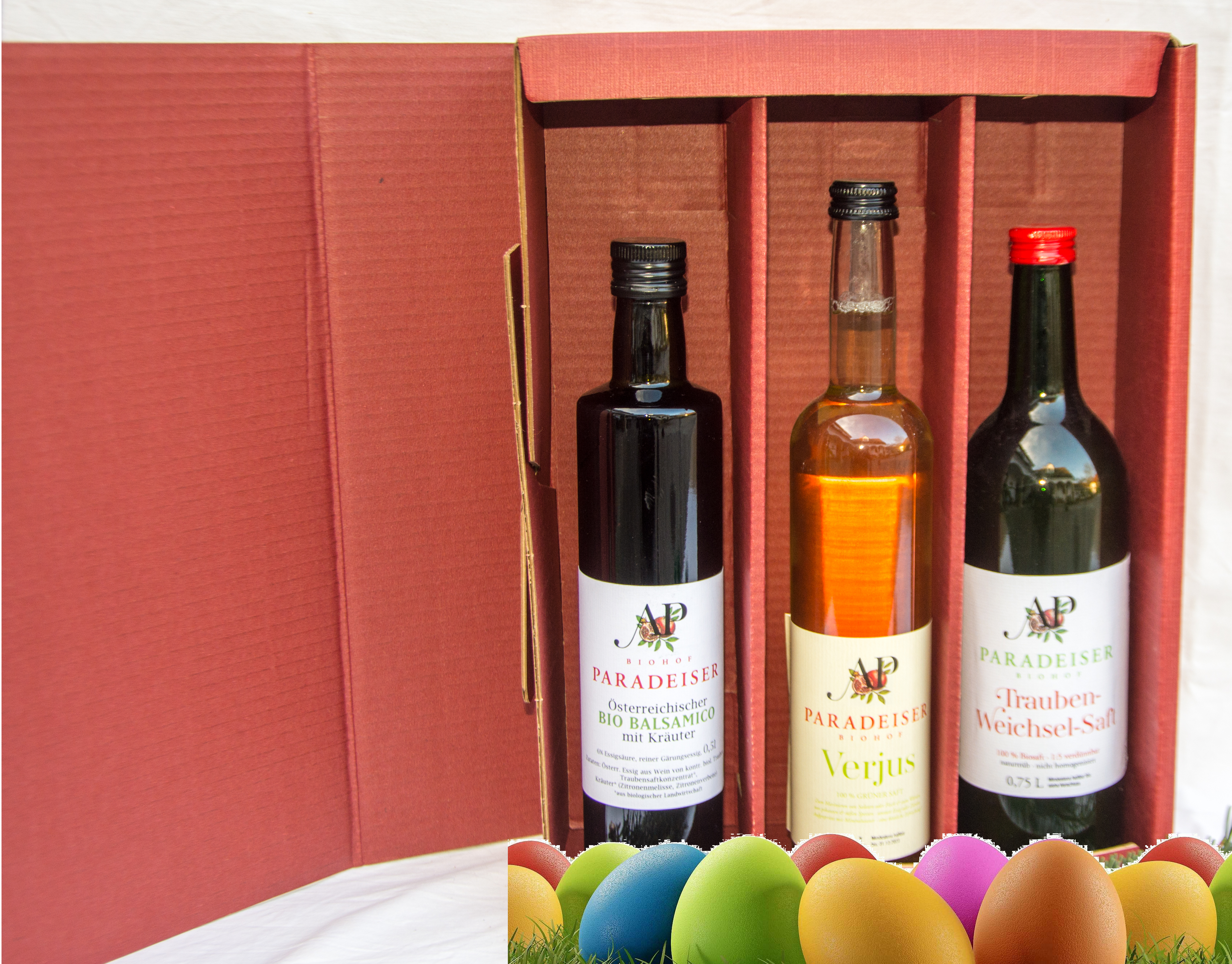 Köstliche Fruchtaufstriche, Säfte, Verjus und Weine, verpackt im Geschenkkarton.